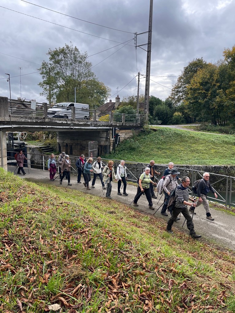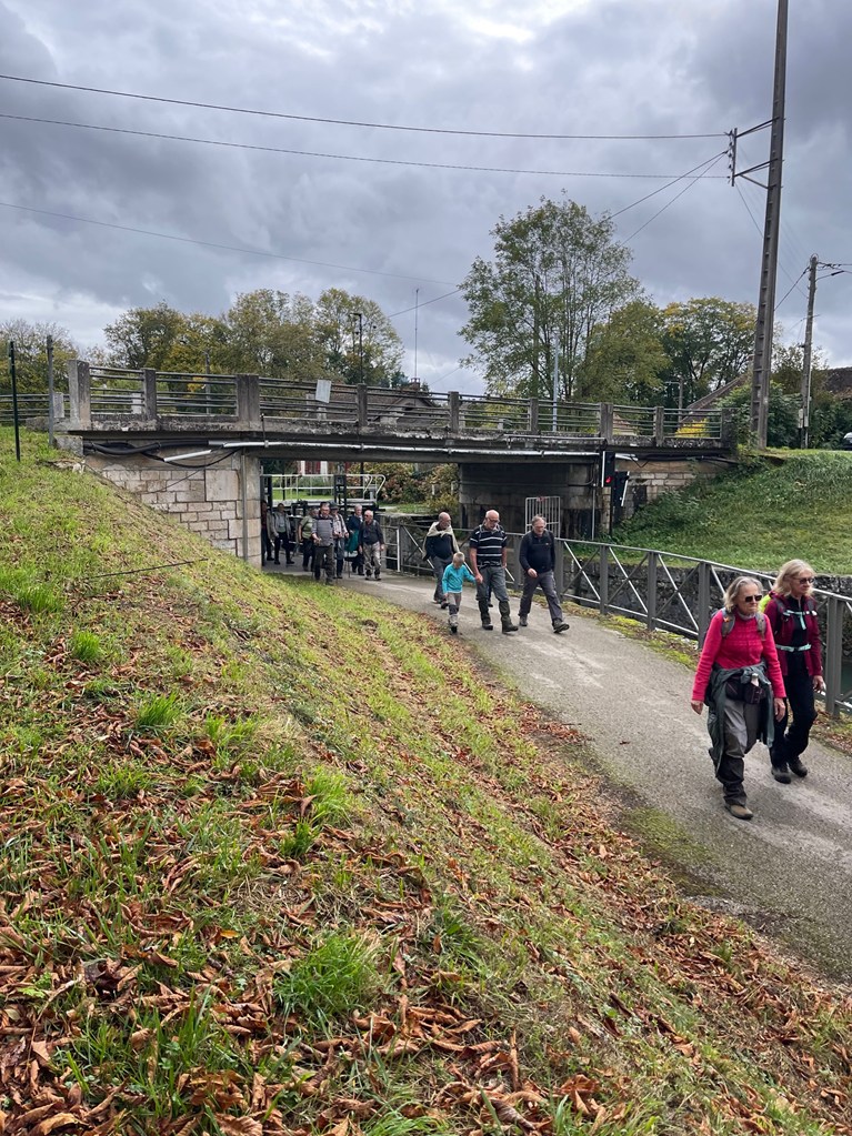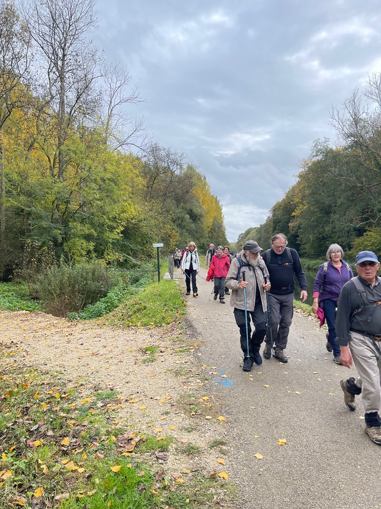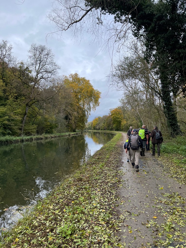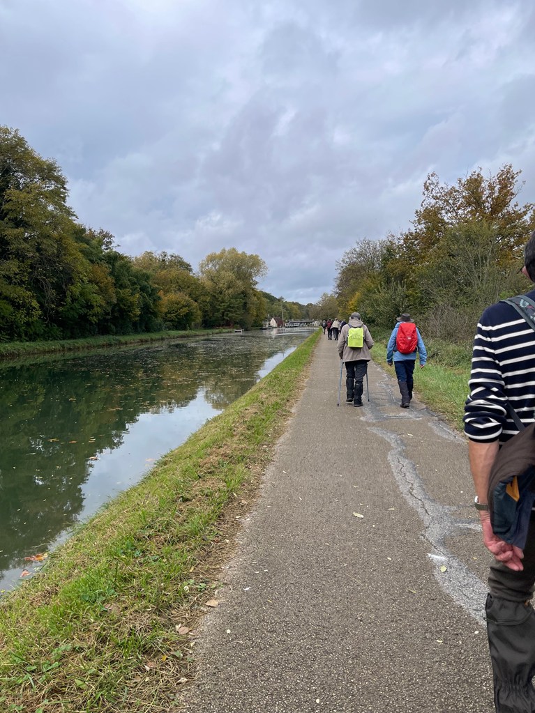 Descente jusqu’à l’écluse de la Sablonnière par le bois de Beauregard, marche au long du canal sur la Scandibérique jusqu’à l’écluse de la Tuilerie, passage par la rue des Ponts, la rue de Mormant pour rejoindre le haut de Conflans où les chemins nous mènent successivement au Clos du Canal, les Grands Champs, la Petite et la Grande Fosse, retour par les Fourneaux et l’allée des Peupliers ou Yolaine nous attendait pour nous servir le pot de l’amitié malgré la pluie qui ,elle aussi, arrivait.